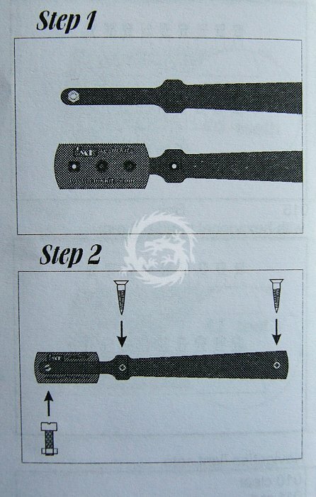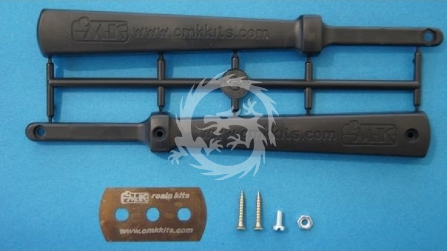 Ten zestaw zawiera plastikowe elementy rękojeści, żyletkę piłkę, dwie śruby do drewna i jedną zwykłą śrubę z nakrętką.