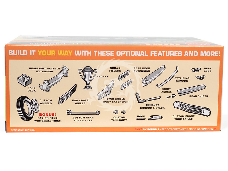 Ten zestaw przy krawężniku z pewnością zadowoli Cię zaawansowanymi opcjami stylizacji i dostosowywania. Dostępnych jest wiele opcjonalnych funkcji, w tym osłona chłodnicy na jajka, niestandardowa osłona chłodnicy z przodu, wypełniacze osłony chłodnicy, przedłużenie gondoli reflektora, przedłużenie korpusu z podwójną osłoną chłodnicy, czerpak na masce, tylne osłony i wiele innych. Zestaw zawiera również opony BONUS z białymi ściankami i niestandardowymi kołami. Dostępny jest także ZUPEŁNIE NOWY arkusz kolorowych naklejek z mnóstwem opcji, a całość zapakowana jest w opakowanie AMT w stylu vintage.