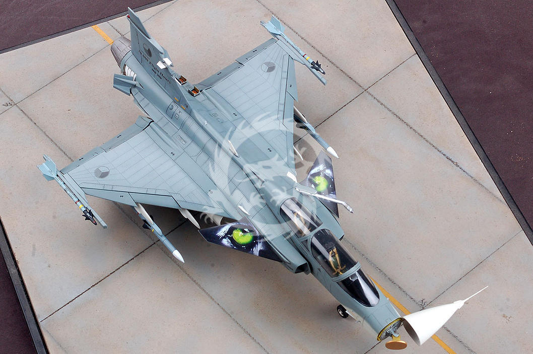 Saab JAS-39 Gripen to szwedzki, jednosilnikowy myśliwiec wielozadaniowy w układzie kaczki i o układzie średniopłata. W 1980 roku rząd Szwecji podjął uchwałę o rozpoczęciu programu badawczego, którego celem byłoby opracowanie następcy samolotu AJ-37 Viggen. Projekt techniczny wykonano w czerwcu 1981 r. Po akceptacji strona rządowa złożyła w maju 1982 r. zamówienie na opracowanie prototypów i wykonanie 140 sztuk JAS-39 Gripen ("Gryf"). Trzy miesiące później rozpoczęto próby w locie elektrycznego układu sterowania (fly-by-wire) zamontowanego na specjalnie do tego przystosowanym Viggenie. Prace nad prototypami rozpoczęto w roku 1984. Pierwszy z nich opuścił halę montażową 26 kwietnia 1986 roku. Z powodu wielu trudności z układem sterowania oblot nastąpił dopiero 9 grudnia 1988 roku, 18 miesięcy po planowanym terminie. Podczas szóstego z kolei lotu, 2 lutego 1989 r., przy podejściu do lądowania Gripen przechylił się w lewo i zawadził skrzydłem o pas lotniska. Przyczyną wypadku była nadmierna czułość owego nieszczęsnego układu "fly-by-wire". Do czerwca 1991 oblatano trzy następne prototypy, na których testowano ulepszony układ sterowania, systemy nawigacyjne i uzbrojenia oraz silnik i awionik. Katastrofa na pokazach w dniu 8 sierpnia 1993 roku była powodem kolejnych zmian - tym razem oprogramowania układu sterowania. 4 marca 1993 oblatano pierwszy seryjny egzemplarz JAS-39A (wersji jednoosobowej). Przekazanie go siłom zbrojnym Szwecji miało miejsce 8 czerwca 1996 roku. Ogółem do końca 1996 roku lotnictwo szwedzkie ma 30 samolotów "Gripen" A. Obecnie trwają intensywne próby obejmujące loty na dużych kątach natarcia. Przewiduje się także wprowadzenie nowszej wersji oprogramowania układu sterowania przewodowego we wszystkich eksploatowanych i produkowanych w przyszłości maszynach. Do lipca 2002 roku do Flygvapnet zostało przekazanych 122 samolotów Gripen. 6 września 2002 roku został przekazany pierwszy JAS-39C Gripen. Dane techniczne (wersja JAS-39C): długość: 14,1m, rozpiętość skrzydeł: 8,4m, wysokość: 4,5m, prędkość maksymalna: 2200km/h, zasięg maksymalny: 3200km, pułap maksymalny 15200m, uzbrojenie: stałe- pojedyncze działko Mauser BK-27 kal. 27mm, podwieszane- najczęściej 6 pocisków AIM-9 Sidewinder.
