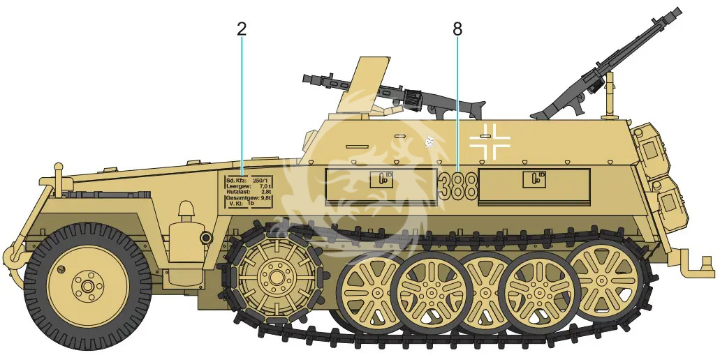Ten plastikowy zestaw do samodzielnego montażu, wyprodukowany przez czeską markę produkującą zestawy wojskowe Special Armor od Special Hobby, zawiera trzy rodzaje niemieckich kalkomanii wojskowych.