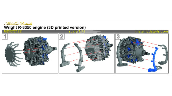 Wyjątkowo szczegółowa, drukowana w technologii 3D wersja silnika gwiazdowego Wright R-3350, dostępna w skali 1/72. Idealny dodatek do modeli samolotów z okresu II wojny światowej i powojennego, takich jak B-29 Superfortress, Lockheed Constellation i B-32 Dominator. Zestaw charakteryzuje się precyzyjnymi kształtami i dbałością o detale, co czyni go idealnym rozwiązaniem dla modelarzy pragnących zwiększyć realizm silnika i dokładność historyczną. Łatwy w integracji z modelami samolotów w skali, oferuje wysokiej jakości rozwiązanie do modelowania kokpitu i detali zewnętrznych.