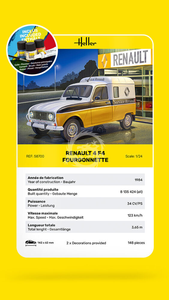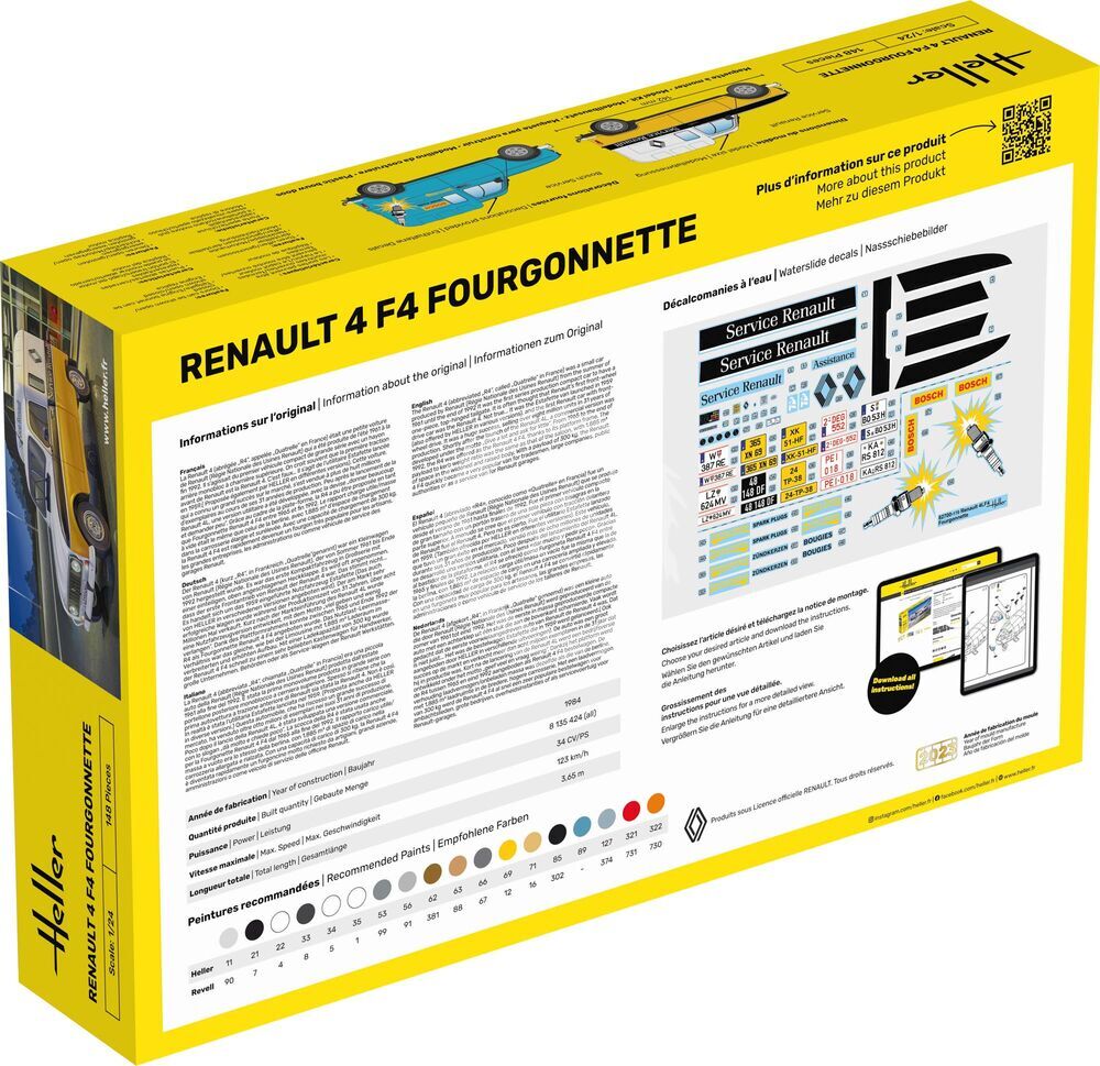 Renault 4 (w skrócie „R4”, nazywany we Francji „Quatrelle”) był małym samochodem produkowanym przez Renault (Régie Nationale des Usines Renault) od lata 1961 do końca 1992. Był to pierwszy seryjnie produkowany samochód kompaktowy z jednoczęściową, otwieraną do góry klapą tylną. Często uważa się, że pierwszym samochodem Renault z napędem na przednie koła był Renault 4. Nieprawda... Był to furgon Estafette wprowadzony na rynek w 1959 roku (oferowany również przez HELLER w różnych wersjach). i pierwszy samochód Renault z napędem na przednie koła. Odniósł ogromny sukces, sprzedając się w ponad ośmiu milionach egzemplarzy w ciągu 31 lat produkcji. Krótko po wprowadzeniu na rynek Renault 4L opracowano wersję komercyjną pod hasłem „Daj dużo i proś o mało”. Od 1965 do końca 1992 roku R4 był oferowany jako Renault 4 F4, dzięki swojej ramie platformy. Stosunek ładowności do masy własnej był taki sam jak w sedanie, z przestrzenią 1,885 m³ w poszerzonym i podniesionym nadwoziu. Z ładownością 300 kg, Renault 4 F4 szybko stał się bardzo popularnym vanem dla rzemieślników, dużych firm, instytucji publicznych, a także jako samochód serwisowy dla warsztatów Renault.