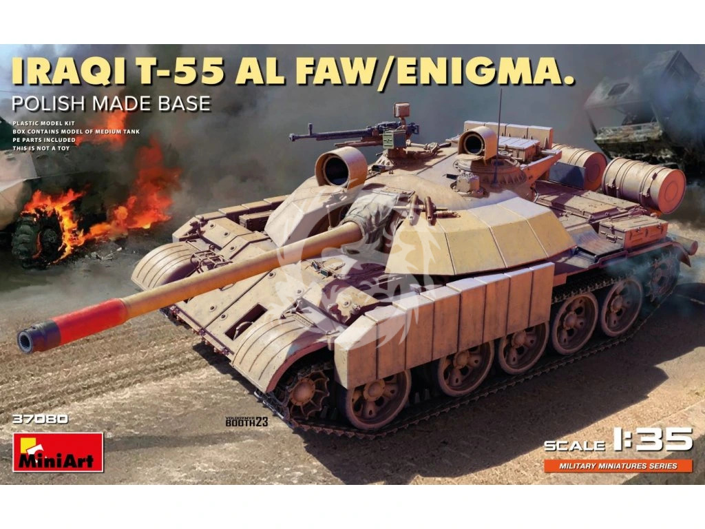 T-55 był jednym z najpowszechniej używanych czołgów zimnej wojny, a wiele krajów opracowywało różnorodne programy modernizacyjne dostosowane do lokalnych potrzeb. Irak w latach 80. XX wieku. W latach 80. Irak zmodyfikował niektóre ze swoich czołgów T-55, dodając warstwowy dodatkowy pancerz do wieży i przedniej części kadłuba, aby zwiększyć ich przeżywalność na współczesnym polu bitwy. Maszyny te, nieoficjalnie znane jako „Enigma”, zostały użyte podczas wojny w Zatoce Perskiej w 1991 roku. Pomimo improwizowanego pochodzenia, stanowiły interesujący przykład próby dorównania rosnącej sile zachodnich systemów przeciwpancernych. Model MiniArt przedstawia wariant zbudowany na polskiej bazie produkcyjnej T-55, który różnił się między innymi detalami odlewu, wyposażeniem i niektórymi cechami konstrukcyjnymi.