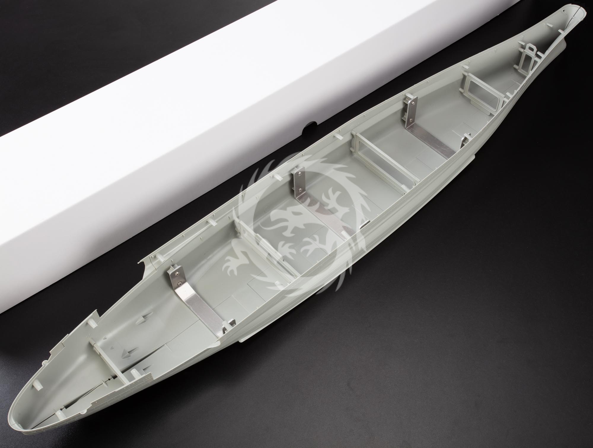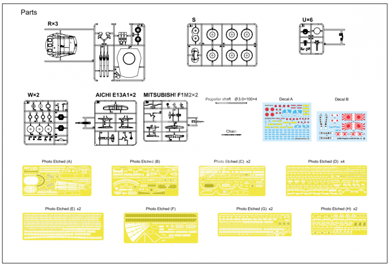 Model plastikowy japońskiego superpancernika Yamato, Glow2B Modellbau, PREMIUM. Zestaw zawiera: 38 wyprasek z częściami modelu kadłub, pokład i nadbudówki; piętnaście arkuszy z elementami fototrawionymi, dwa arkusze kalkomanii; dwie metalowe rurki do wykonania wałów śrub; łańcuch kotwiczny; instrukcja, 2800 elementów, skala 1/200.