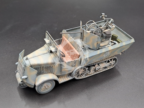 - Przebudowa: Niemcy dodali lekkie opancerzenie (do 10 mm) i zamontowali armatę przeciwlotniczą 2 cm Flak 38 na otwartym przedziale bojowym.