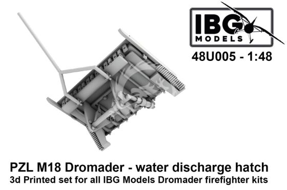 IBG 48U005 PZL M18 Dromader – Water Discharge Hatch – 3D Printed Set 1/48 to zestaw dodatków modelarskich wykonanych w technologii druku 3D, przygotowany do modeli PZL M18 Dromader w skali 1/48. Produkt obejmuje element klapy zrzutu wody, charakterystyczny dla konfiguracji wykorzystywanej w lotnictwie gaśniczym. Zestaw stanowi dodatek i nie jest kompletnym modelem. Przeznaczony jest do zastosowania jako uzupełnienie lub wymiana części zestawowych.
