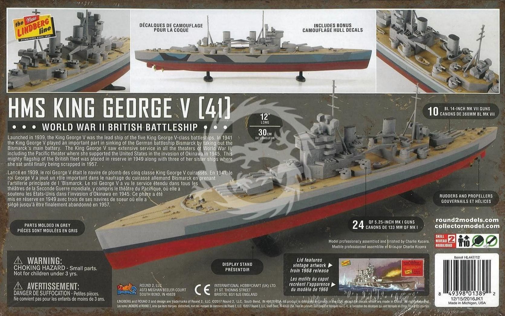 Model Lindberg HL447/12 HMS King George V w skali 1:750. Cechy: Bardzo szczegółowe plastikowe elementy w kolorze szarym, stery i śruba napędowa, 10 dział BL kal. 14 cali Mk. VII, 24 działa QF kal. 5,25 cala Mk. I, podstawka ekspozycyjna, bonus: kalkomanie kadłuba w kamuflażu, kalkomanie Waterslide, ilustrowana instrukcja. OPCJE OZNACZANIA: Jeden arkusz kalkomanii z oznaczeniami dla 2 wersji: 1) HMS King George V (1943) 2) HMS King George V (1944).