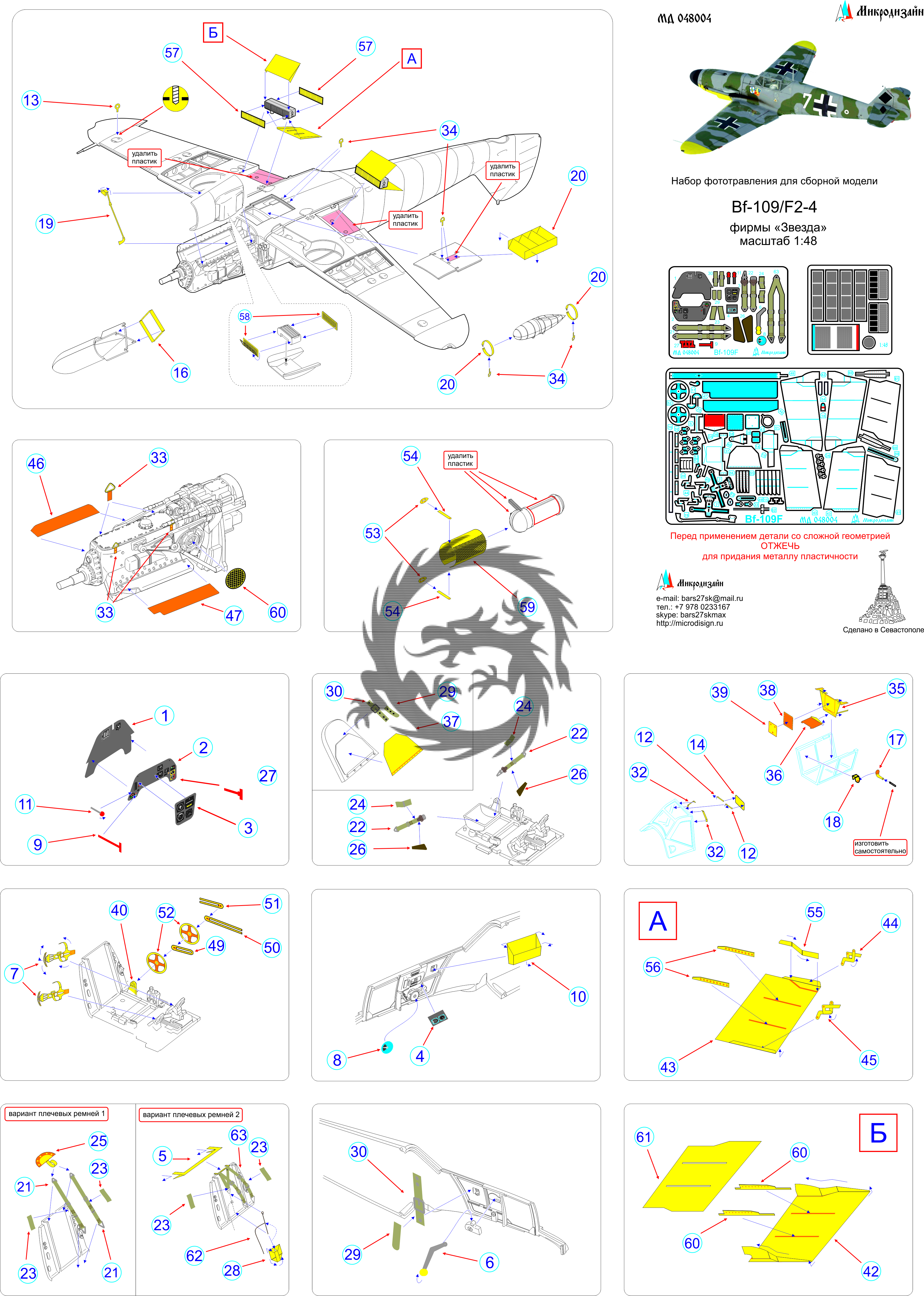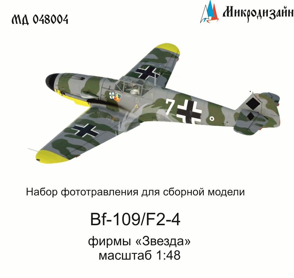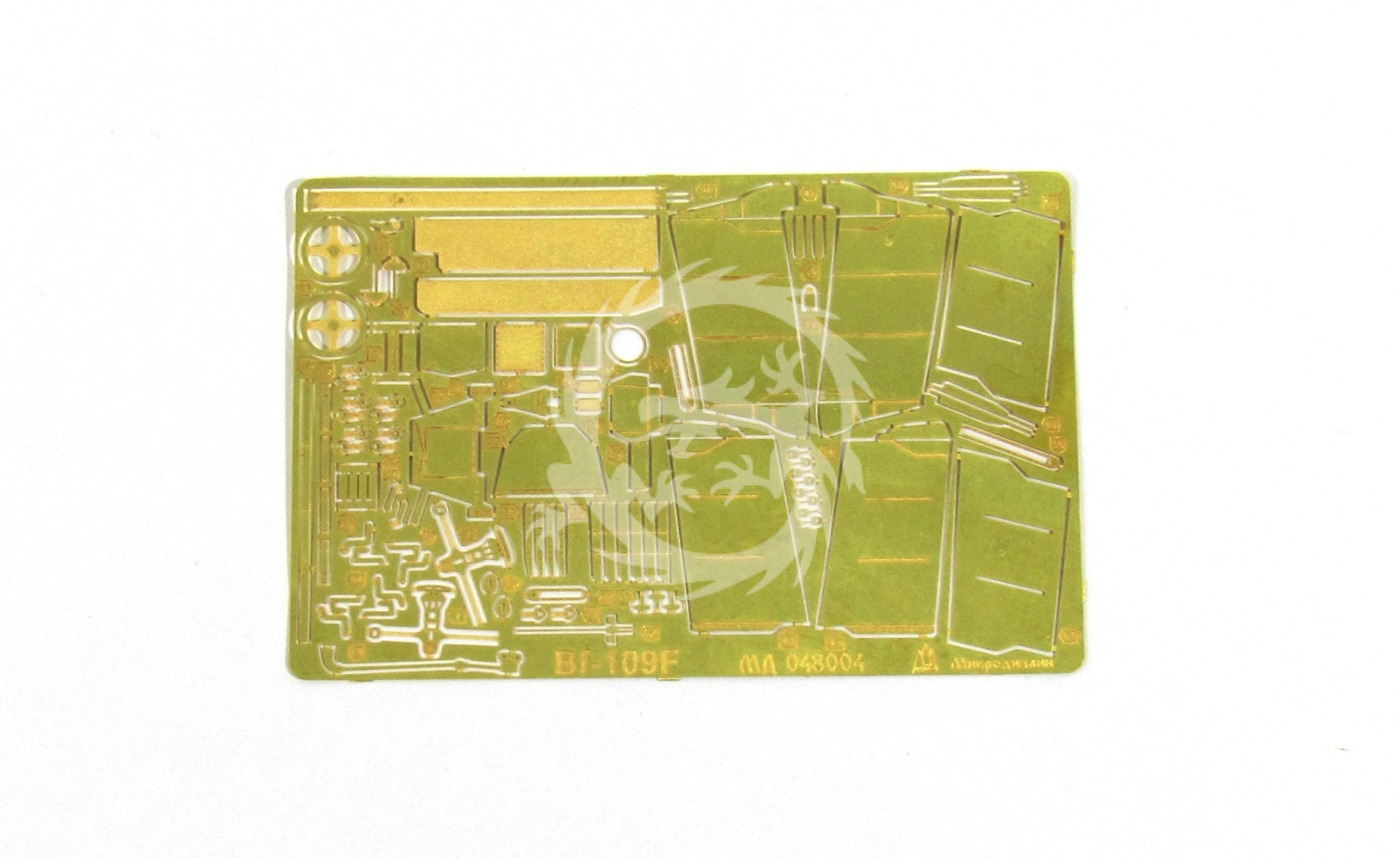 Zestaw elementów fototrawionych, do samolotu myśliwskiego Messerschmitt Bf-109F, Microdesign, skala 1/48. Zestaw zawiera: trzy blaszki (mosiądz 0,15 mm) fototrawione z elementami w tym jedna z elementami pomalowanymi (deska rozdzielcza, pasy) całkowita liczba części 47; instrukcja. Zestaw przeznaczony dla modeli Bf-109F firmy Zvezda w skali 1/48.