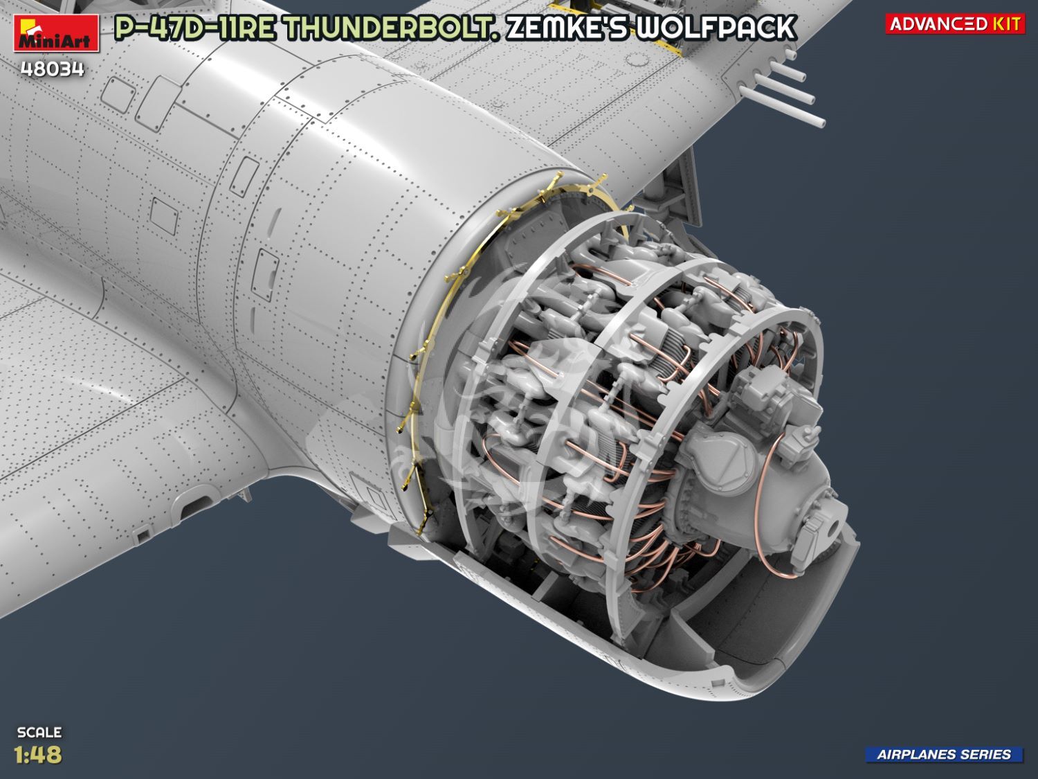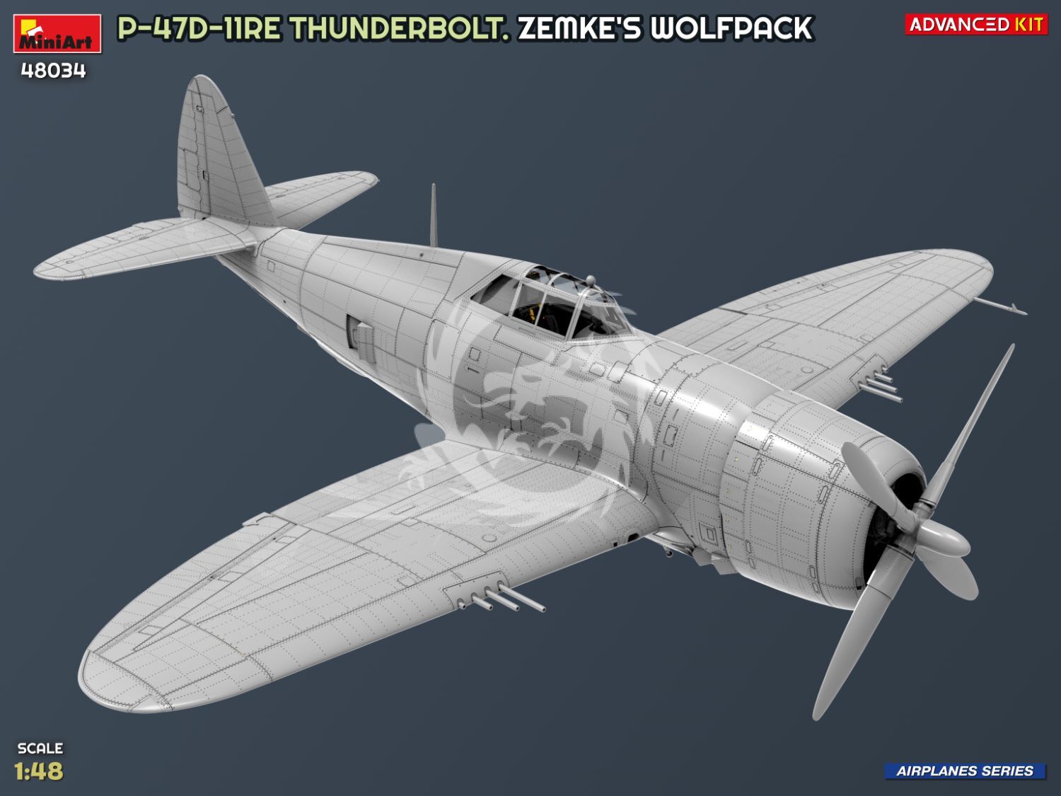 P-47D Thunderbolt stanowił trzon 56. Grupy Lotniczej – słynnego „Wolfpack” Huba Zemkego. Ten zaawansowany zestaw pozwala na zbudowanie samolotu odrzutowego ze szczegółowym odwzorowaniem silnika, wnętrza kokpitu i dodatkowymi detalami, w tym częściami fototrawionymi i przezroczystymi, co zapewnia jeszcze większy realizm.