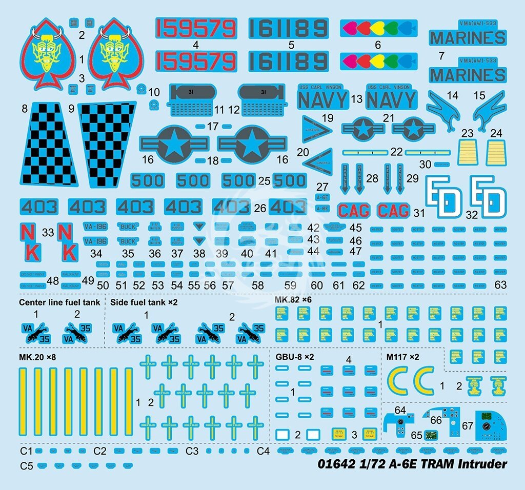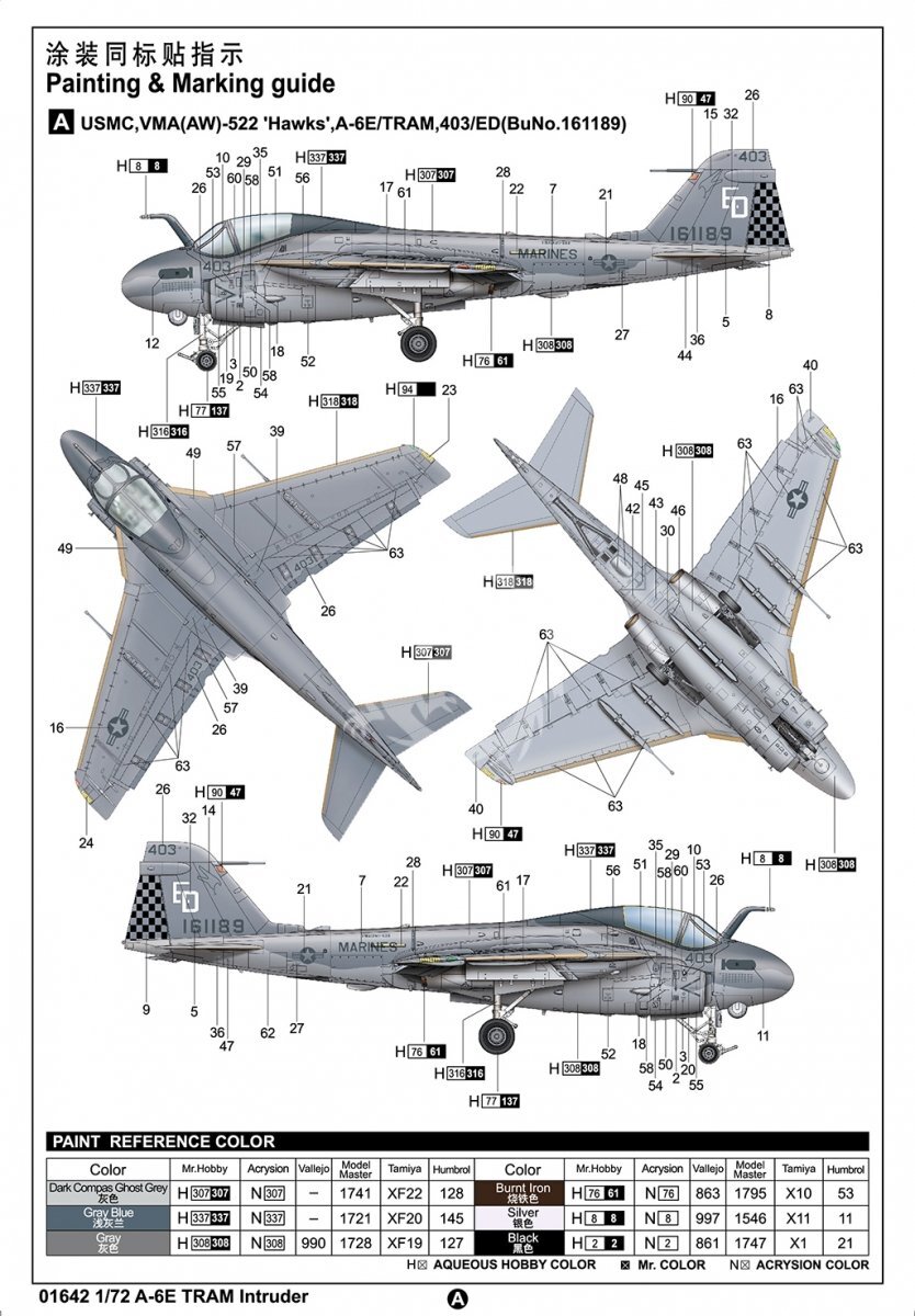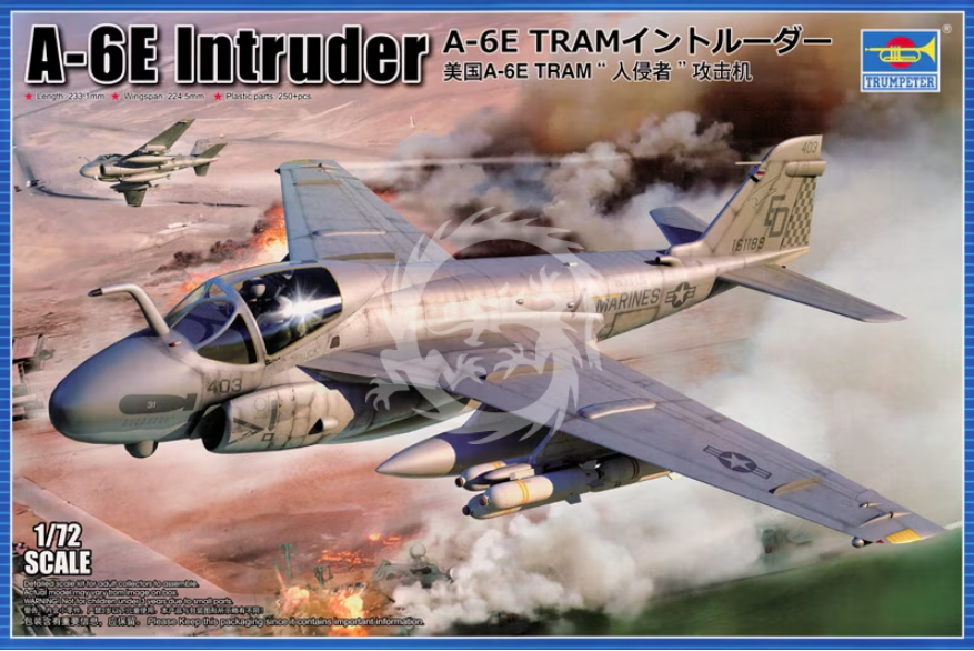 Model **A-6E TRAM Intruder** firmy Trumpeter (numer katalogowy 01642) w skali 1/72 to szczegółowy zestaw modelarski, który pozwala na zbudowanie precyzyjnej repliki amerykańskiego samolotu szturmowego z okresu zimnej wojny i wojny w Wietnamie. Poniżej znajduje się szczegółowy opis tego modelu:
